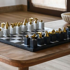 Play in style with this luxury chess set crafted from granite and steel, finished in elegant golden and white/black tones. Modern, durable, and sophisticated — perfect as a gift or centerpiece for your home.