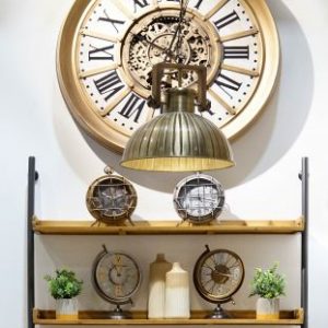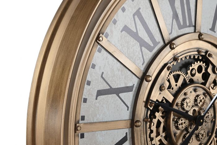 Crafted entirely from sturdy iron with a golden finish and contrasting white details, this clock blends decorative appeal with timeless elegance — ideal for interiors seeking an industrial yet sophisticated touch.